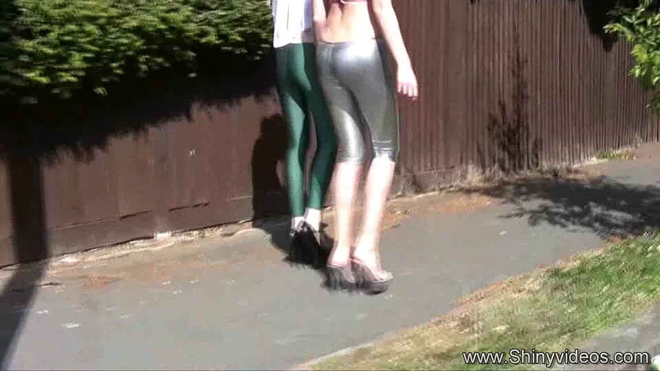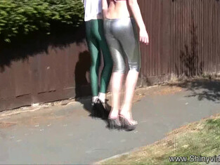 We find Tina & Danielle lost near a train station, Tina dressed in a pair of Green Spandex Leggings, High Heels & a white top & Danielle dressed in a shocking Pink Wetlook Crop Top, Wetlook Silver Leggings & high heels... They look hot! We try to help them find the man they are meeting, but all we really wanted to do was film their spandex clad bodies!!